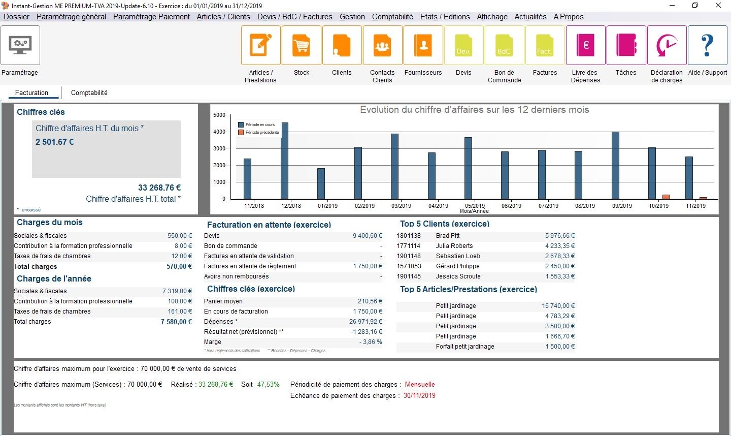 logiciel de gestion de la TVA pour micro-entrepreneur INSTANT-GESTION me PREMIUM TVA 2022, lintègre au delà de la gestion de la TVA toutes les fonctionnalités pour la gestion et la comptabilité de votre micro-entreprise. La version PREMIUM TVA intègre en plus des versions CLASSIC, PREMIUM et PREMIUM +, la gestion comptables de votre activité.